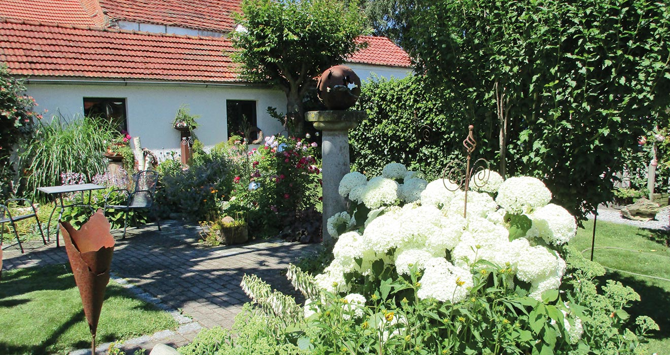 ….in unserem Hausgarten umgeben von Heilkräutern und duftenden Blumen.